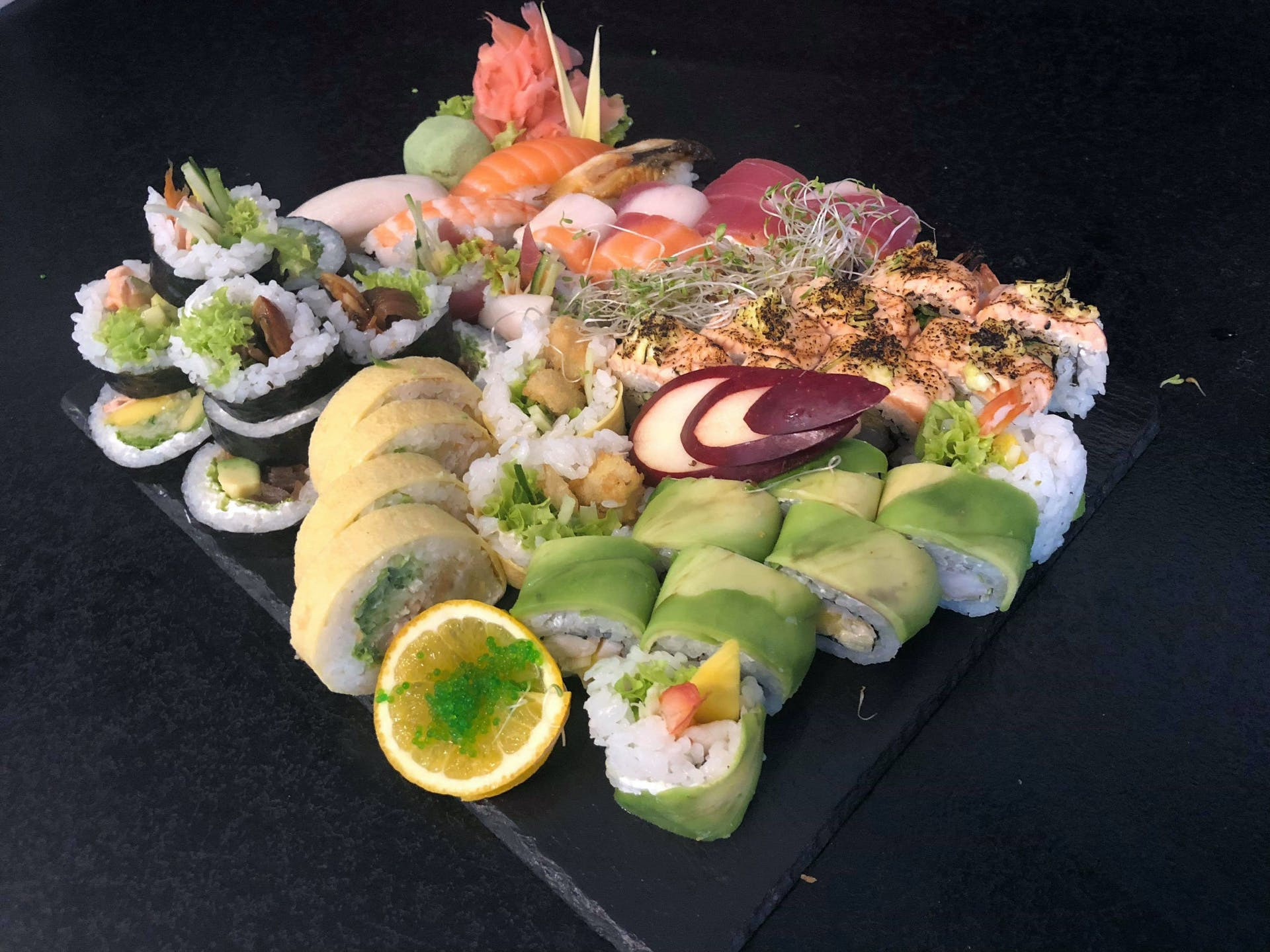 6 szt. futomaki pieczony łosoś, serek, sałata, tykwa, awokado,